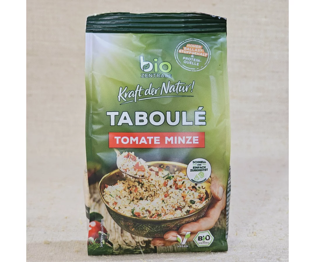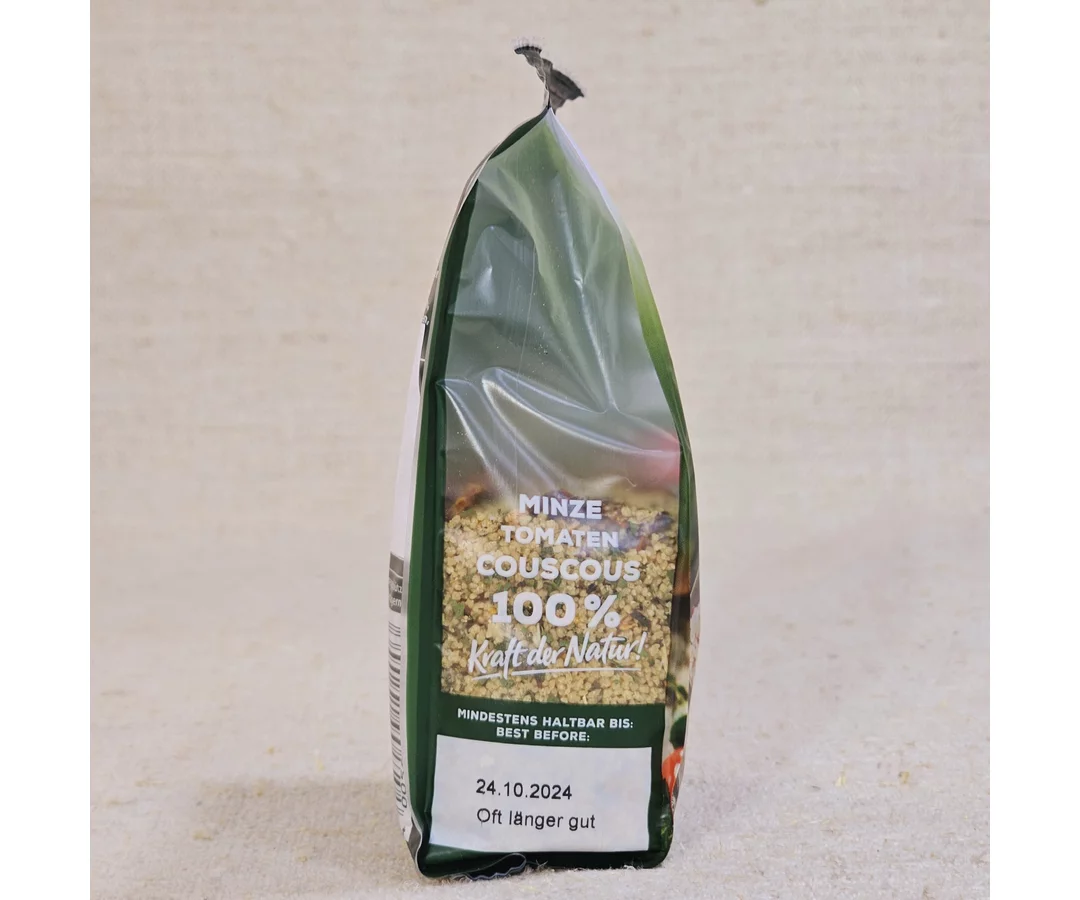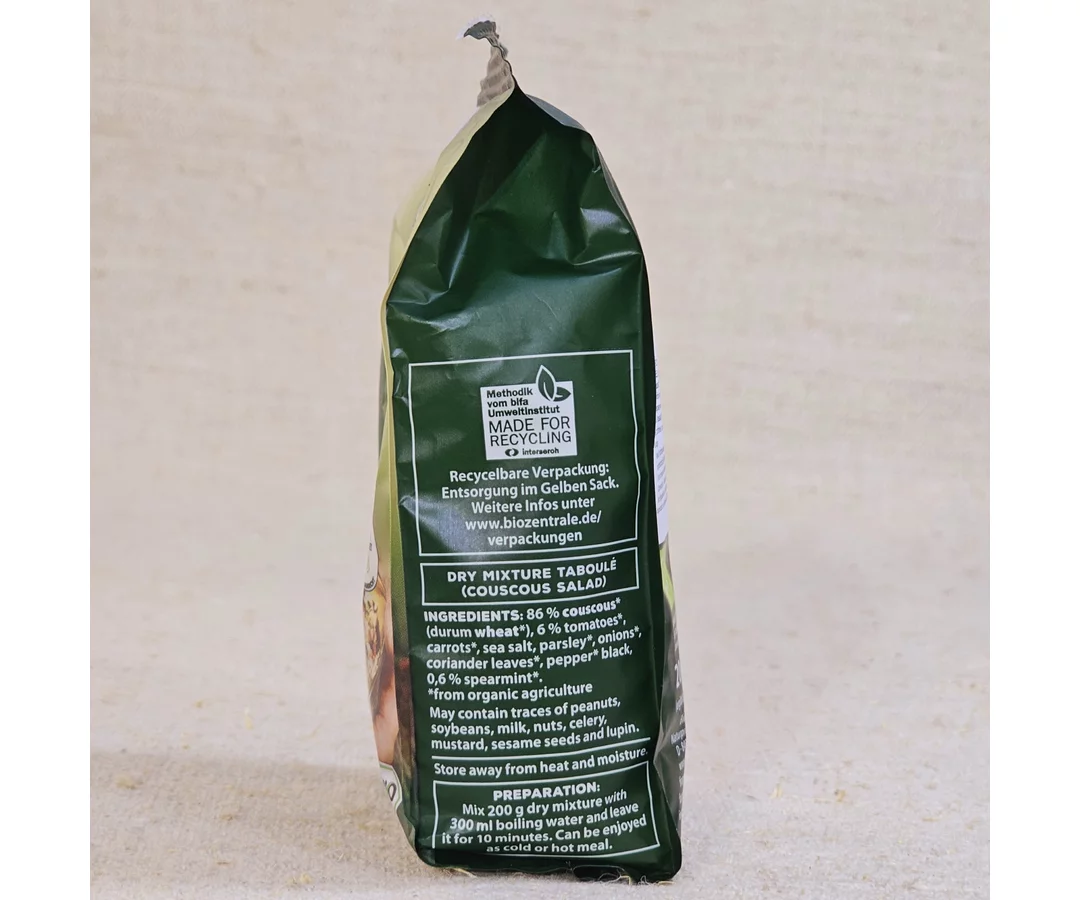 86 % cuscus * ( grâu * ) , 5,8 % granule de rosii * , morcov *, patrunjel * , ceapa * , sare de mare , coriandru * , piper * 0,6 %, mentă *