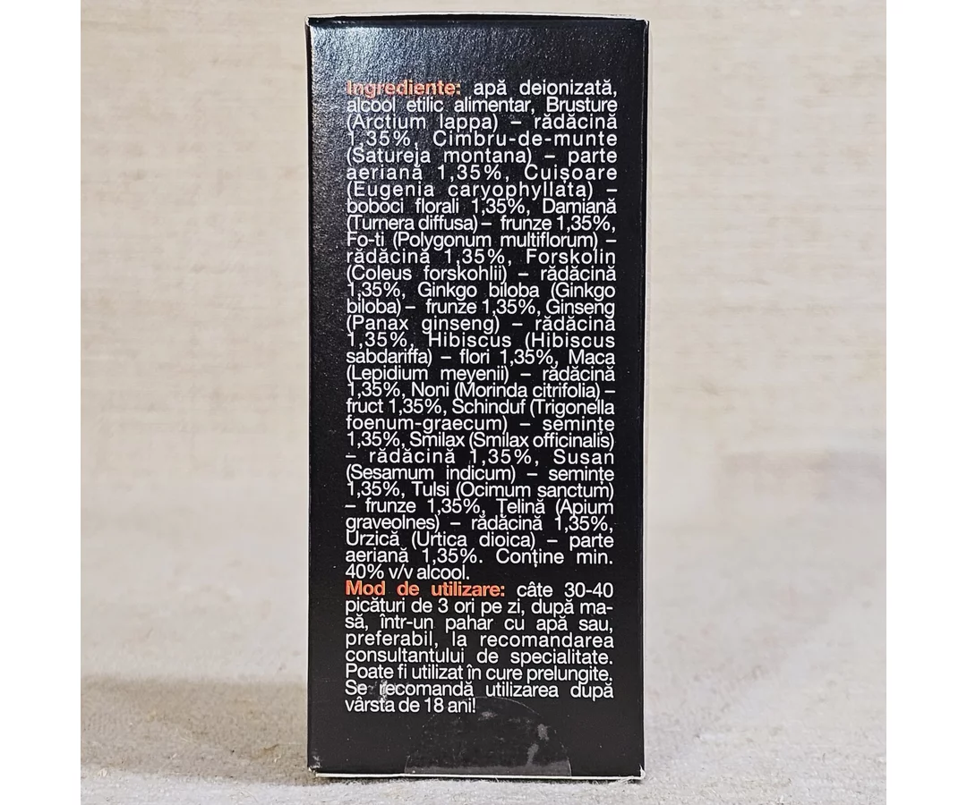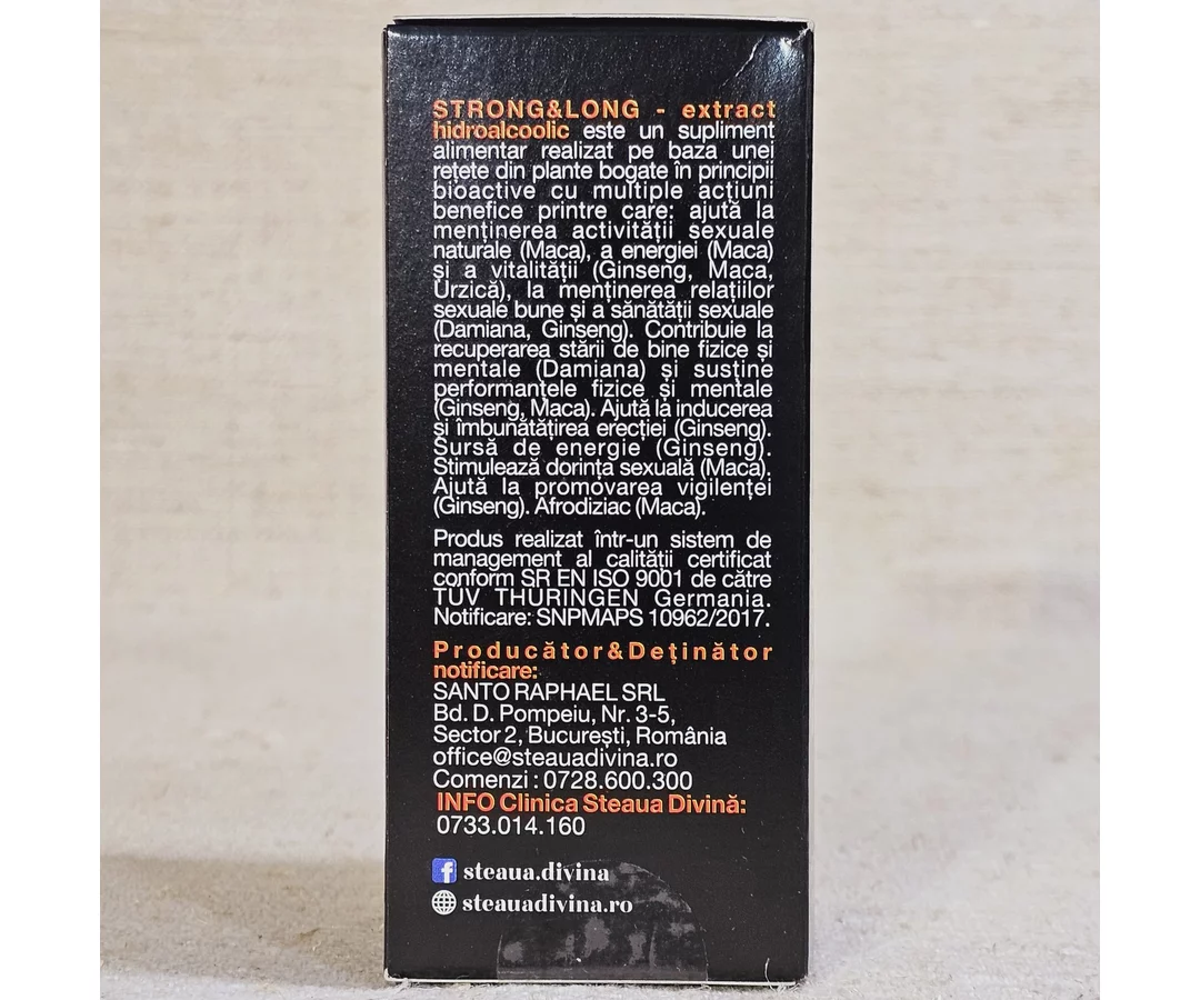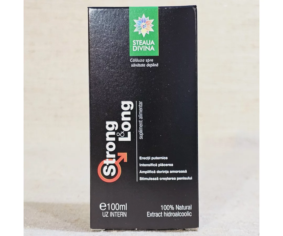 Erectii puternice! Intensifica placerea! Amplifica dorinta amoroasa! Stimuleaza cresterea penisului! STRONG&LONG –extract hidroalcoolic, preparat dupa o reteta din 17 plante medicinale printr-o metoda de procesare ce asigura concentratia maxima a substantelor bioactive, amplifica si Compozitie: Brusture (Arctium lappa) Cimbru-de-munte (Satureja montana), Cuisoare (Eugenia caryophyllata) , Damiana (Turnera diffusa), Fo-ti (Polygonum multiflorum), Forskolin (Coleus forskohlii) , Ginkgo biloba (Ginkgo biloba) , Ginseng (Panax ginseng) , Hibiscus (Hibiscus sabdariffa), Maca (Lepidium meyenii), Noni (Morinda citrifolia), Schinduf (Trigonella foenum-graecum) , Smilax (Smilax officinalis), Susan (Sesamum indicum), Tulsi (Ocimum sanctum), Telina (Apium graveolnes), Urzica (Urtica dioica), Conține min. 40% v/v alcool. Actiuni: Este afrodiziac, imbunatateste si mentine functia sexuala masculina, favorizeaza depasirea inhibitiilor, creste tonusul fizic si psihic si confera optimism; produce o dinamizare generala, are efect vitalizant, regenerator, este adaptogen si un excelent tonic general. Indicatii: Se utilizeaza pentru: stimularea si imbunatatirea performantele sexuale masculine, cresterea apetitului sexual, imbunatatirea functiei erectile si sexuale la barbati. Precautii la administrare: A nu se depasi doza prescrisa; precautii la persoanele cardiace. Contraindicatii: Afectiuni hepatice si renale grave, sarcina, alaptare, persoane carora le este interzis/limitat consumul de alcool; alergie la plante din familia Lamiaceae si/sau Umbeliferae sau la oricare dintre componentele produsului. Mod de administare: Cate 30-40 picaturi de 3×/zi, dupa masa, intr-un pahar cu apa, sau, preferabil, la recomandarea consultantului de specialitate.Poate fi administrat in cure prelungite.Se recomanda utilizarea dupa varsta de 18 ani!