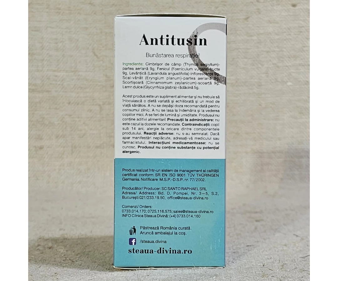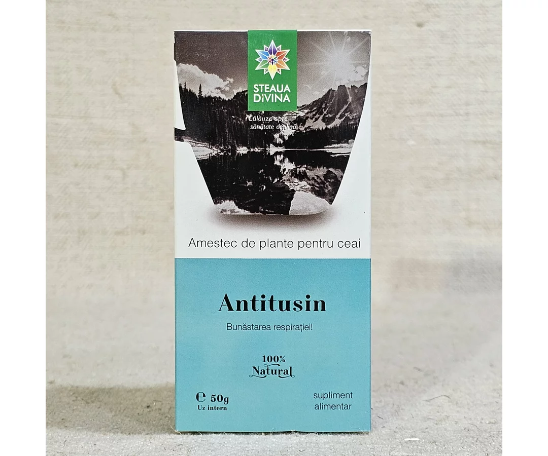 Antitusin reteta de plante pentru ceai este antitusiv, antiseptic al cailor respiratorii, emolient si calmant al mucoaselor iritate, fluidifica secretiile bronsice, favorizeaza expectoratia.