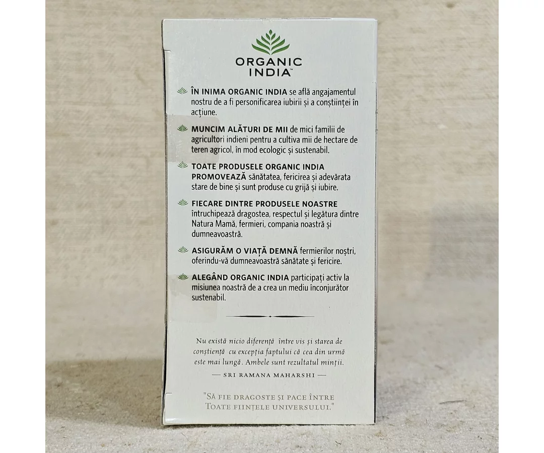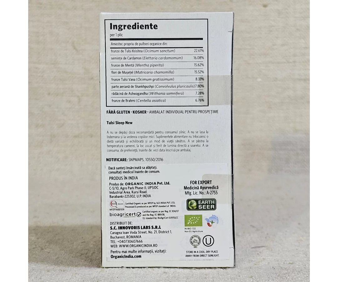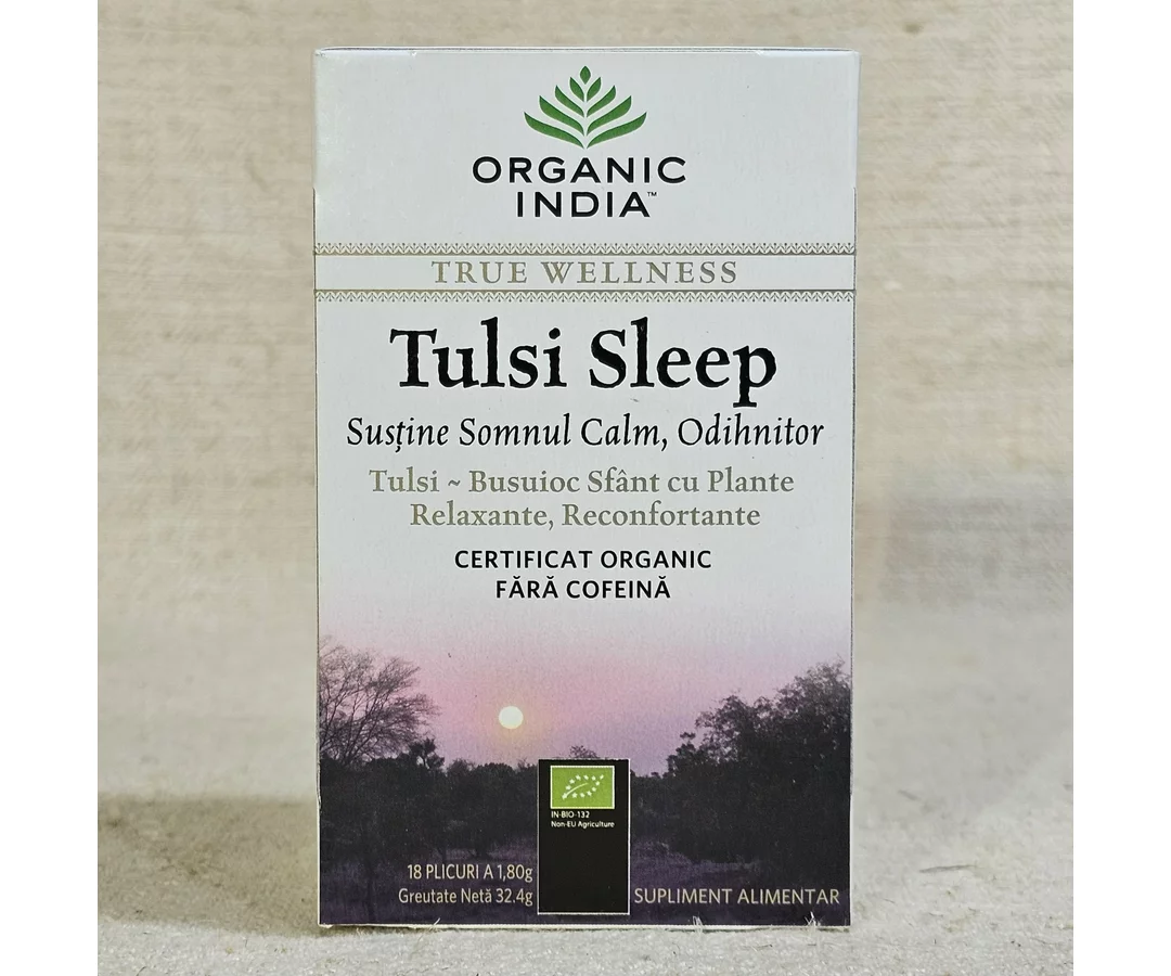 ORGANIC INDIA Ceai Tulsi Sleep cu Plante Relaxante, Reconfortante, Somn Calm, Odihnitor este un produs 100% Certificat Organic si nu contine organisme modificate genetic. Nu contine si nu sunt folosite in niciun stagiu al productiei pesticide sintetice, erbicide, ingrasaminte sau alte tratamente chimice.