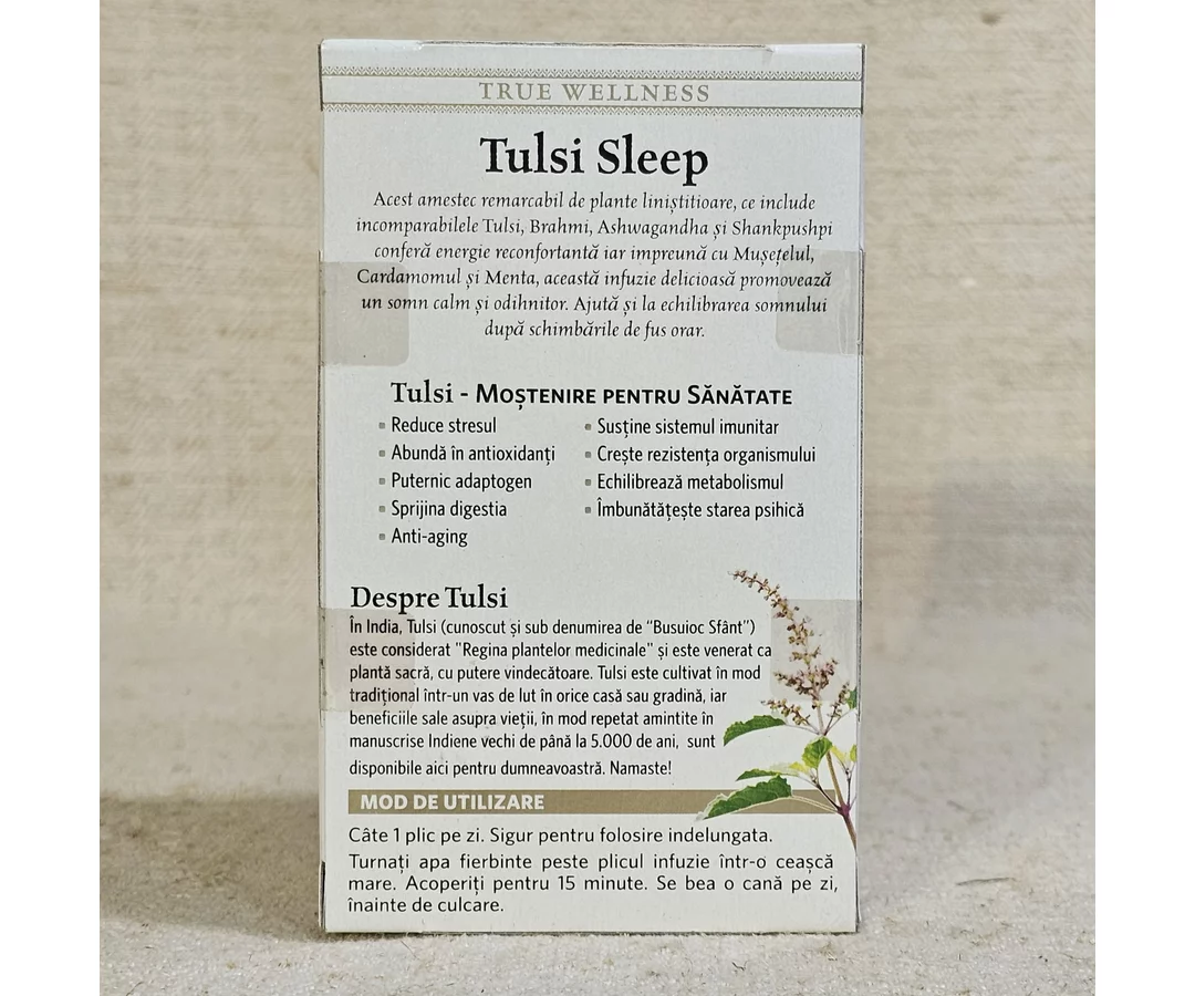 Acest amestec remarcabil de plante linistitioare ce include Tulsi, Brahmi, Ashwagandha si Shankpushpi linisteste organismul si il pregateste pentru un somn odihnitor, sanatos. Impreuna cu Musetelul, Cardamomul si Menta, aceasta infuzie delicioasa promoveaza un somn calm si odihnitor. Ajuta si la echilibrarea somnului dupa schimbarile de fus orar.