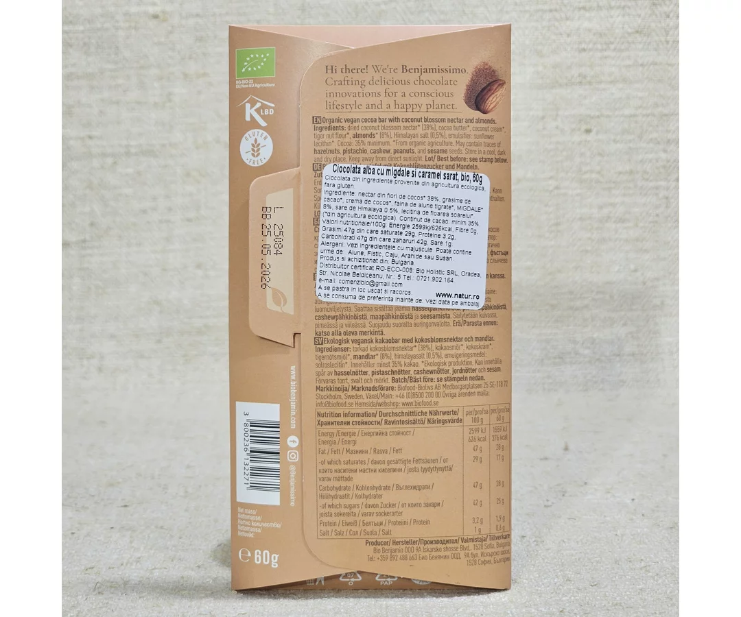 Ciocolată albă cu migdale și caramel sărat ECO 60g