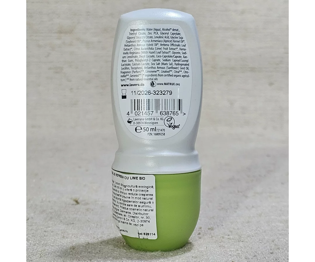 Deodorant Lavera Roll-On Natural & Refresh. Compoziția activă cu var organic și minerale naturale reduce creșterea bacteriilor cauzatoare de miros și astfel previne în mod natural acumularea mirosului de transpirație. Extractele de verbena, tei și flori de hamamelis, împreună cu alte ingrediente, asigură o senzație plăcută de prospețime.
