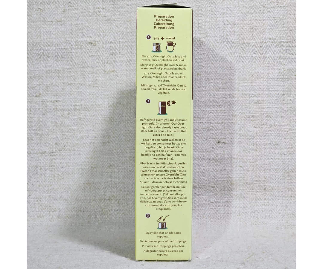 Ingrediente: fulgi ovaz integral 73%, bucati de banane uscate 21%, boabe de cacao sparte si coapte 6%.