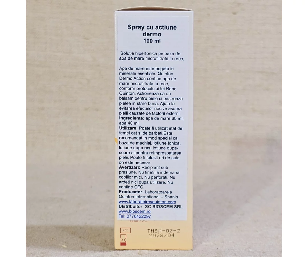 Continutul acestu spray este dublu micro-filtrat la rece, în conformitate cu Farmacopeea Europeană, fără nici un aditiv, complet natural. Nu a fost expus pe durata fluxului tehnologic nici un moment la căldură sau contact cu metale, conservând astfel potențialul sau terapeutic natural. Aceste atuuri au făcut ca produsele Quinton să fie de 100 de ani ajutorul de predilecție al femeilor însărcinate, nou-născuților si copiilor.