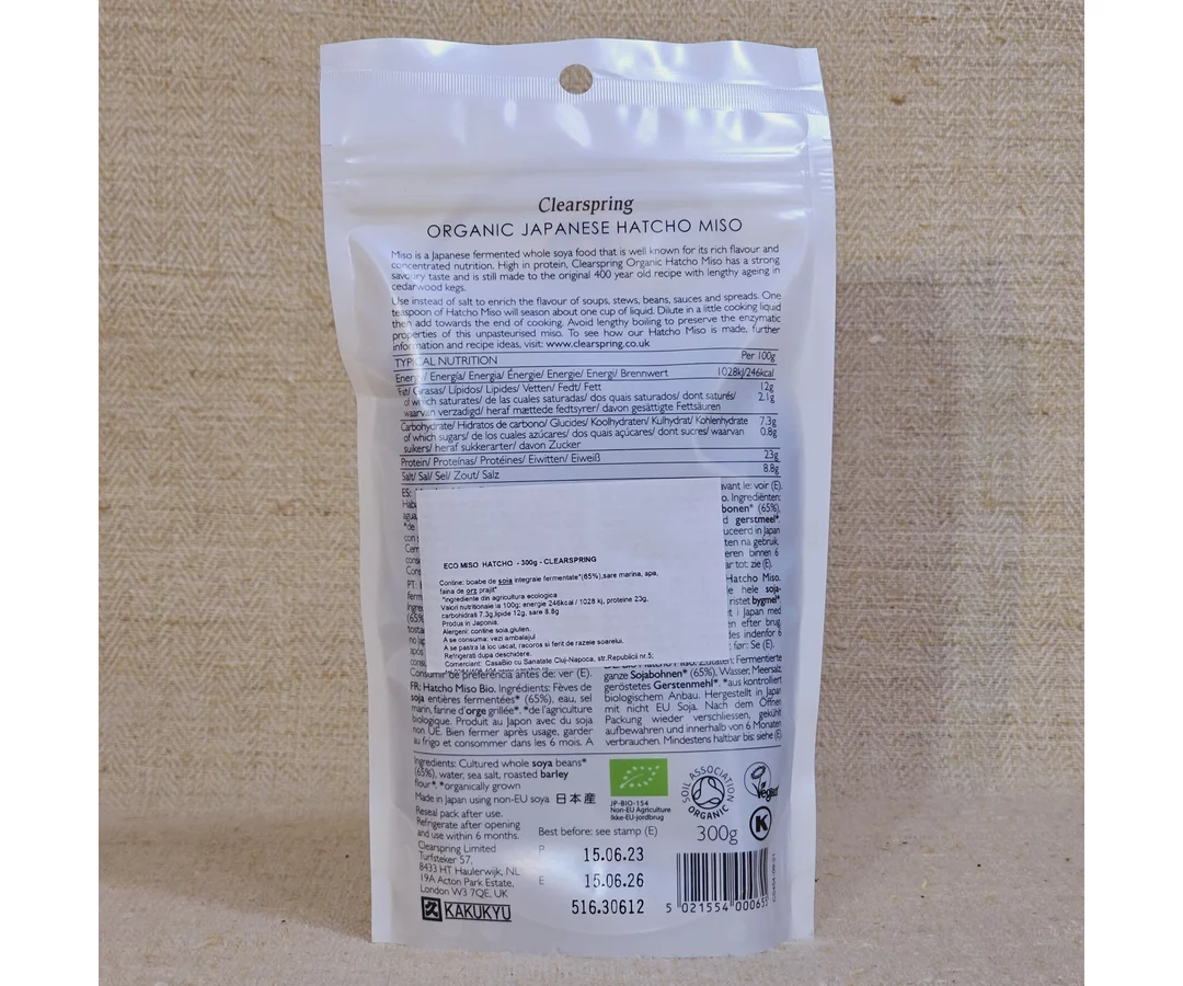 Pasta Miso este un condiment japonez preparat din boabe de soia dupa o reteta traditionala, apreciat pentru aroma sa si proprietatile sale benefice. Se utilizeaza in loc de sare la condimentarea supelor, tocanelor, sosurilor si cremelor tartinabile. Se foloseste o lingurita de Hatcho Miso la o cana de lichid. Diluati pasta in putina supa sau sos si adaugati in mancare spre sfarsitul prepararii. Evitati fierberea prelungita pentru a pastra proprietatile enzimatice ale acestei paste. Ingrediente: