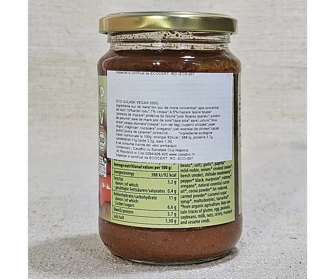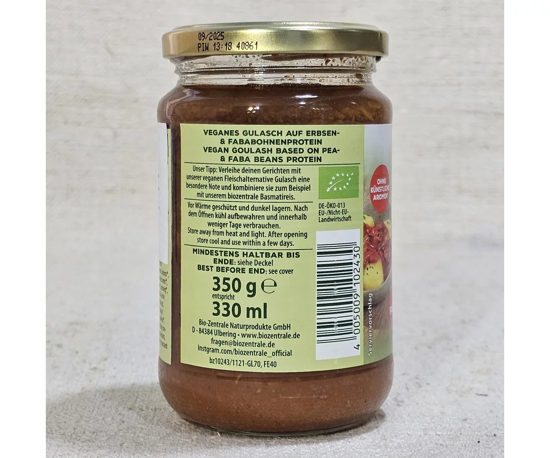 Gulașul nostru vegan are un gust deosebit de bun cu cartofi, găluște, orez, spaetzle sau legume.