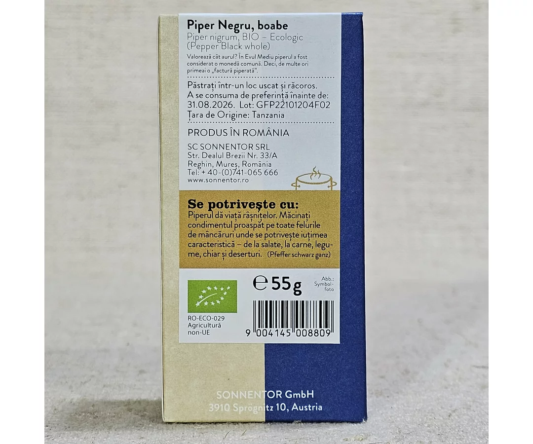• O cutie contine 50g piper negru macinat, produs certificat ecologic.