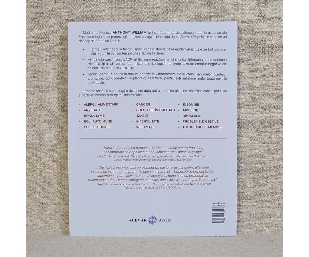 Mediumul Medical Anthony William te învață cum să descătușezi puterile ascunse ale fructelor și legumelor pentru a-ți transforma viața în bine. Iată doar câteva crâmpeie din ceea ce vei descoperi în interiorul cărții: