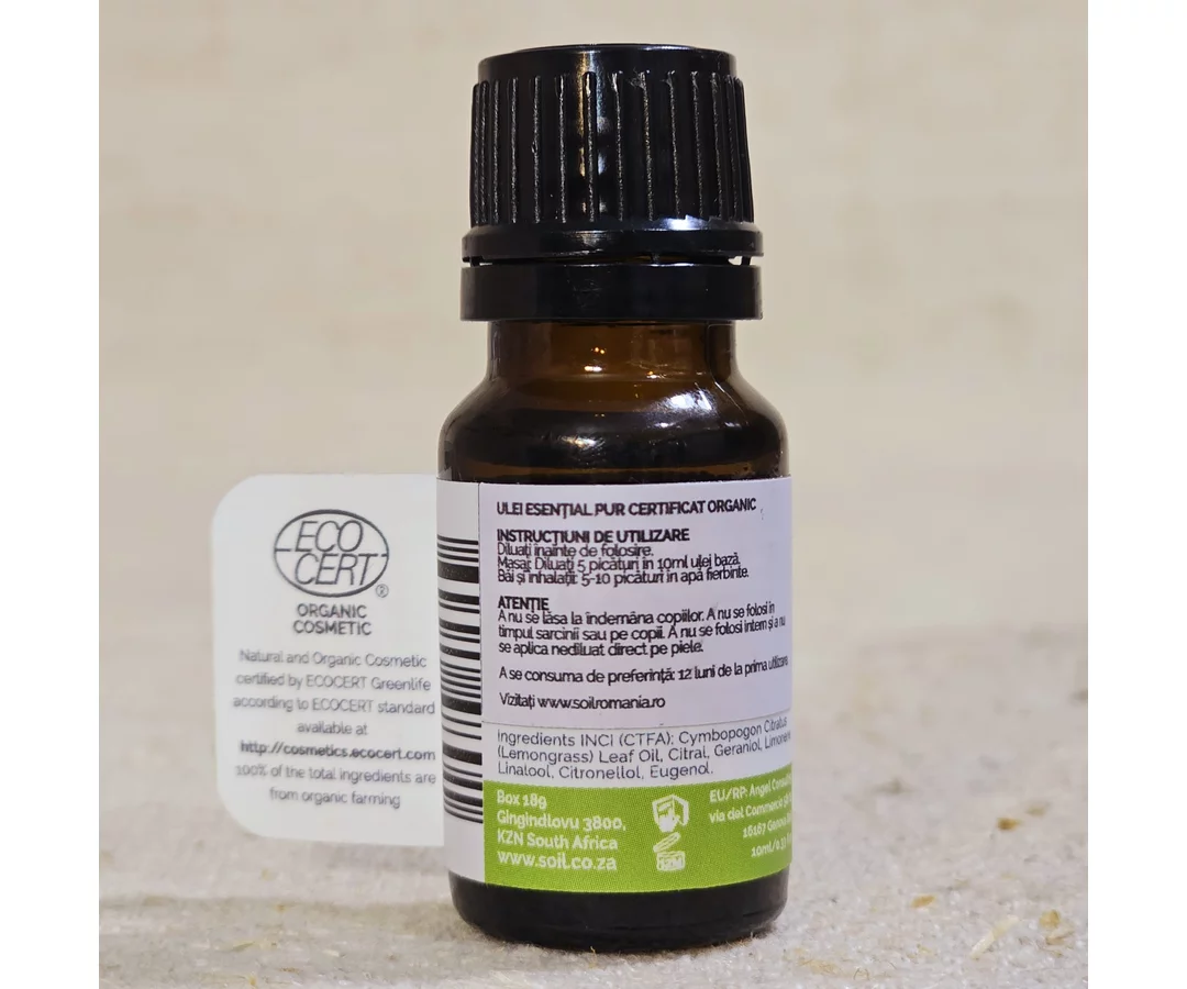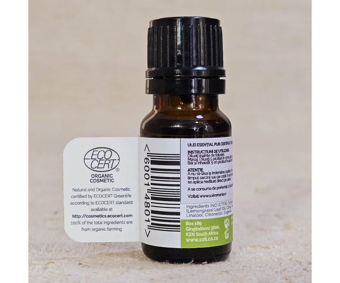 SOiL Ulei Esențial Lemongrass (Cymbopogon citratus) Pur Organic ECOCERT 10 ml este 100% certificat organic de către ECOCERT.