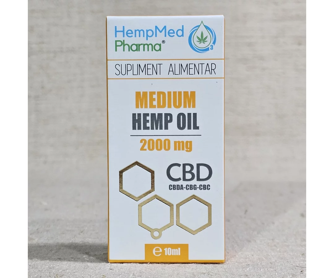 MEDIUM HEMP OIL – CBD 2000 mg este un supliment alimentar cu o formulă bazată în principal pe ulei din semințe de cânepă și extract din părțile aeriene ale plantei de cânepă. Aceste ingrediente sunt completate de ulei de turmeric, ulei de chimen negru și ulei esențial de mentă, alcătuind un amestec bogat în compuși naturali, ușor de integrat într-un stil de viață echilibrat.