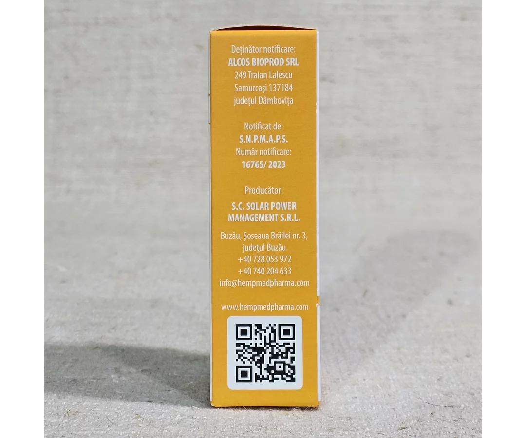 Ingrediente: Ulei din semințe de Cânepă (Cannabis sativa L.); extract total din părți aeriene de cânepă (Cannabis sativa L.); ulei de Turmeric (Curcuma longa); ulei de Chimen-negru (Nigella