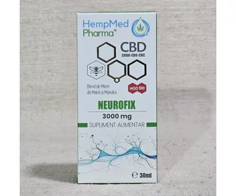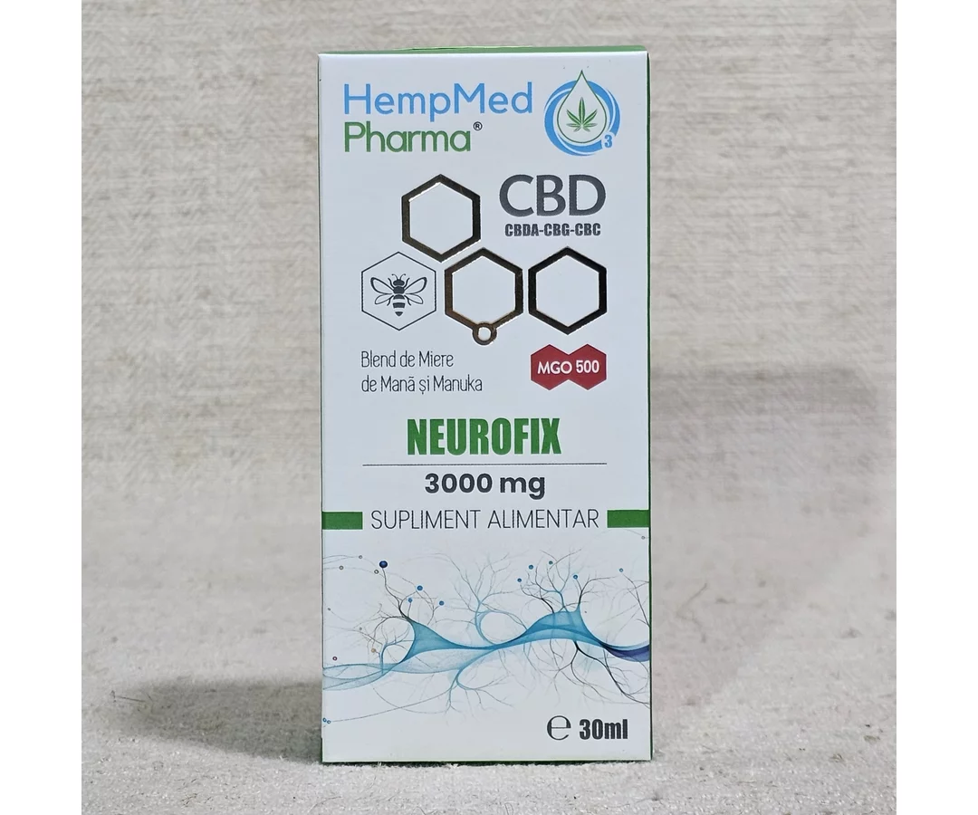 NEUROFIX CBD 3000 mg este un produs 100% natural care contine o combinatie echilibrata de ingrediente precum miere de mana, extract total din partile aeriene de canepa, miere de manuka MGO500, extract hidroetanolic de propolis, extract hidroetanolic din fructe de coriandru si extract hidroetanolic din frunze de Ginkgo biloba, care fiecare in parte ajuta organismul in cazul dezechilibrelor neurodegenerative complexe, putand imbunatati concentrarea, vigilenta si atentia, echilibrand in acelasi timp starea emotionala.