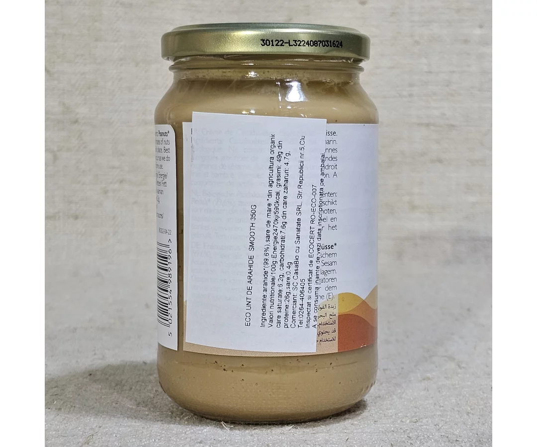 Acest unt de arahide organic are un conținut scăzut de zahăr, dar este delicios de dulce. Se adaugă un vârf de cuțit de sare pentru a scoate în evidență dulceața naturală a nucilor măcinate, care nu sunt de fapt nuci, ci membri ai familiei leguminoaselor.
